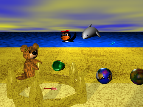 Suddenly they looked back at the beach and Gini saw Felicitas, her teddy bear friend playing in the sand building a sand castle. "Felicitas", Gini yelled, "come and swim with us. It's so nice and refreshing in the water!".
