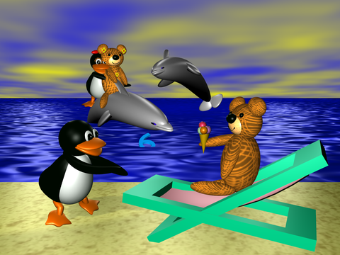 What fun it was. They were riding and jumping and flying through the ocean. But when they looked to the shore where their friend Clive was sitting in a beach chair eating delicious looking ice cream Karl couldn't resist and faster than you could count to 6 he swam to the beach. Amused Clive shared his ice cream with Karl. Of course he then joined his friends in their water dance.